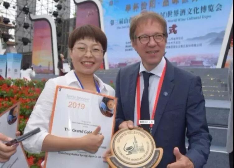 CMB烈酒赛总经理提艾利·汉斯为百脉泉酒业技术总工程师汪慧慧颁发奖牌和证书