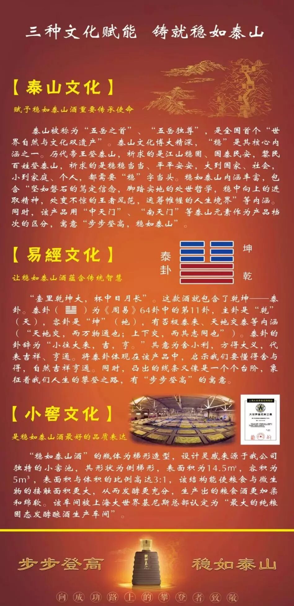 泰山文化博大精深,上至帝王封禅祈求江山稳固、国泰民安;下至百姓登山祈求稳稳当当、平平安安。“稳”是其核心内涵之一,一个“稳”字,赋予稳如泰山酒深厚的文化内涵。“稳如泰山酒”包含“坚如磐石的笃定信念、脚踏实地的处世哲学、稳中向上的进取精神、处变不惊的王者风范、运筹帷幄的人生境界……”,同时,该产品用“中天门”“南天门”等泰山元素作为产品档次的区分,寓意着“步步登高,稳如泰山”。这就与泰山国际登山节这一活动的美好寓意不谋而合,一步一个脚步,稳登泰山之巅。