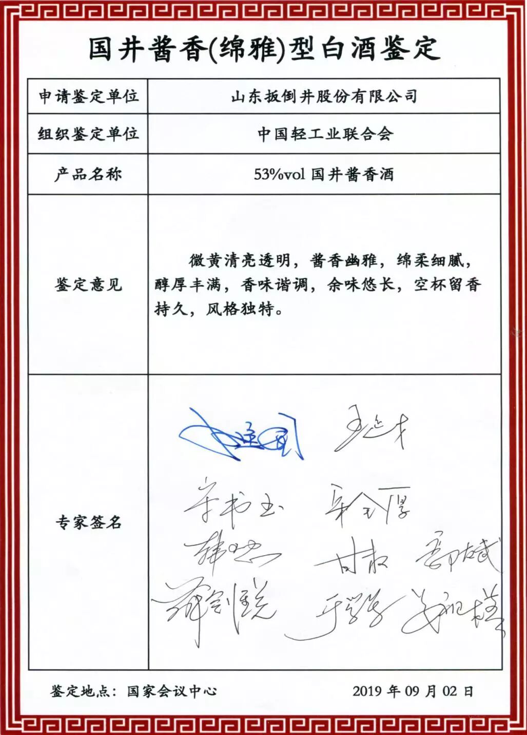 同时,经专家现场品评,一致认为:国井酱香型(绵雅)白酒,微黄清亮透明,酱香幽雅,绵柔细腻,醇厚丰满,香味谐调,余味悠长,空杯留香持久,风格独特。
