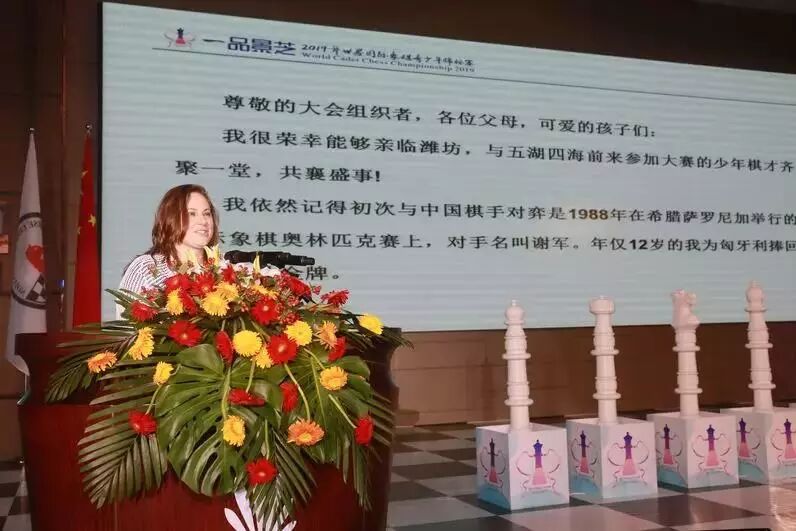 世界国际象棋联合会名誉副主席朱迪特·波尔加(Judit Polgar)女士出席开幕式并发表精彩致辞,带来了世界国际象棋联合会对本届大赛的美好祝福,对组委会的精心筹备表达了诚挚感谢,并坚信这必定会是一届成功的大赛。