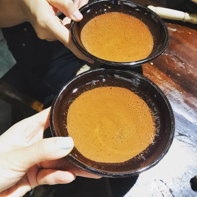 大块吃肉配大碗喝酒,其典型场面名为“推磨”。几瓶白酒一齐倾在大碗里,由首席开始,不用敬让,也无须客气,捧定了酒碗,俯下身去,吱地一声饮将下去,酒面儿必就低下一分,顺手往下一推,第二位照样豪饮,一圈复一圈转下去,只求个一醉方休。