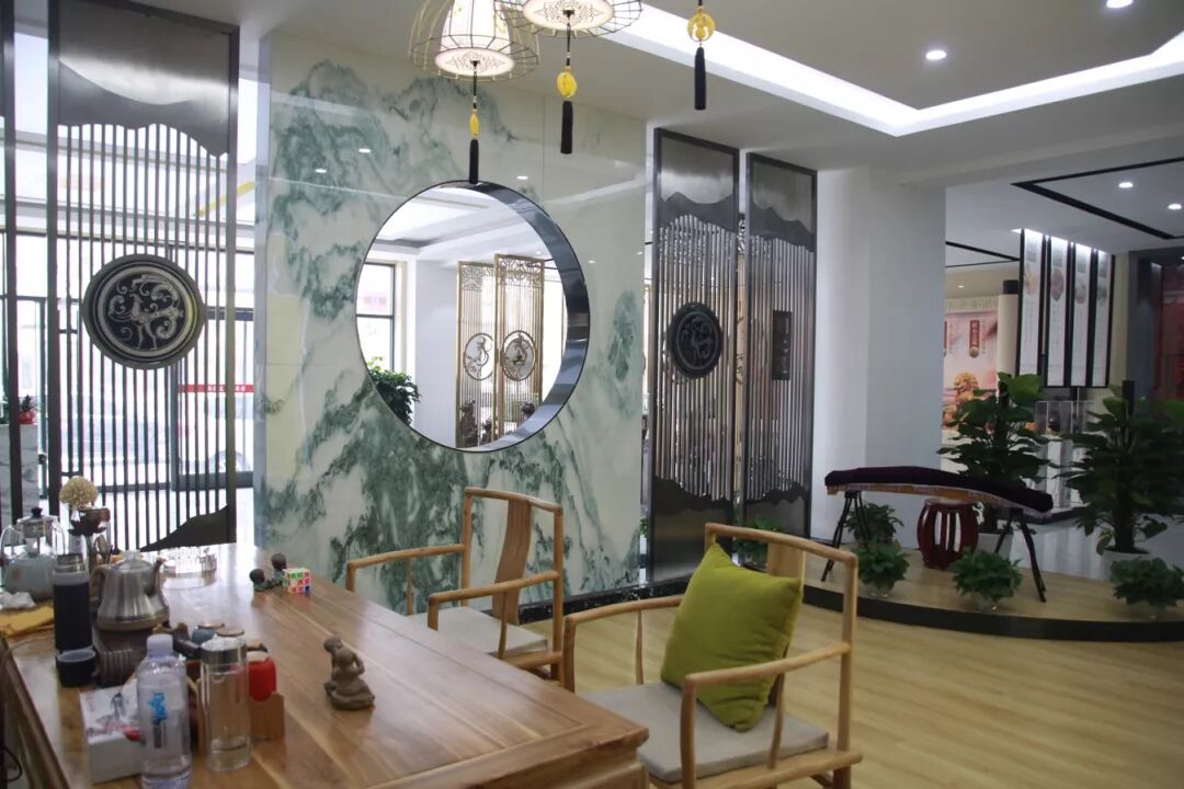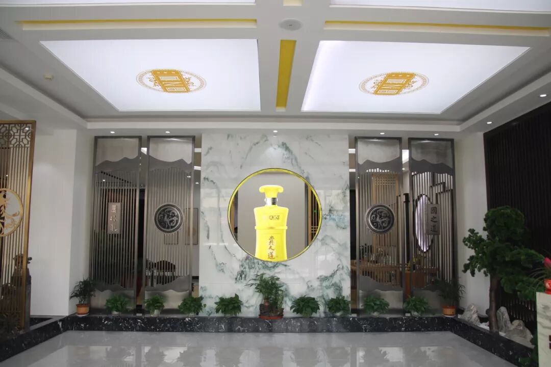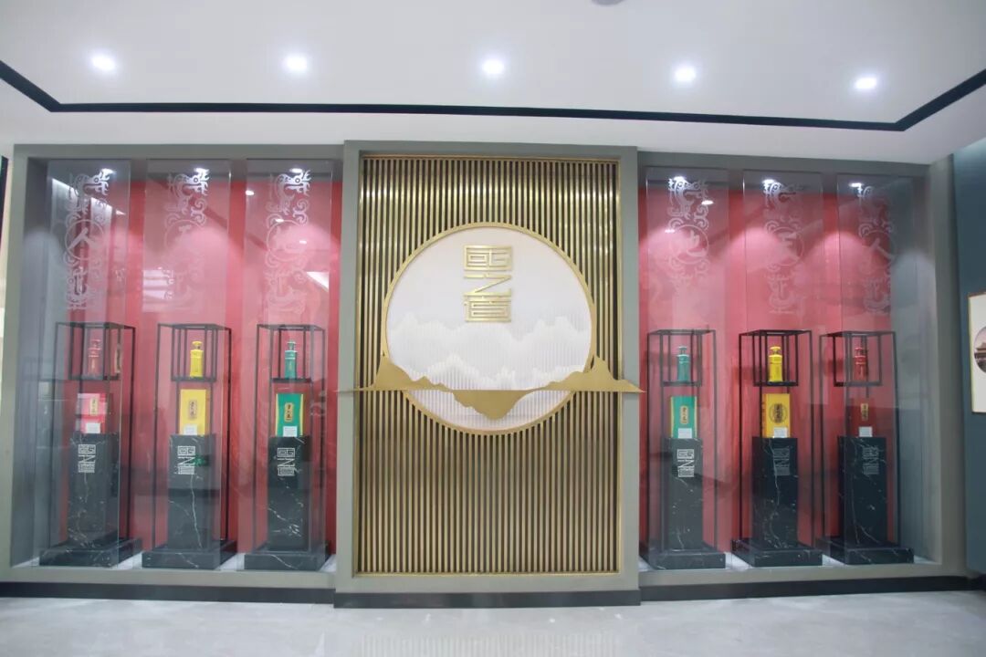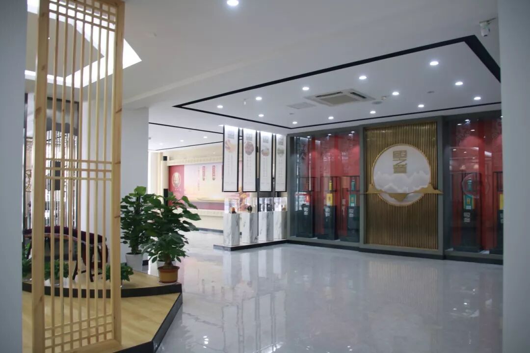 一进门便可看到水墨山水石材的穿透式玄关,透过玄关可看到国之道的代表性产品——天。水墨山水国画和明黄色的国之道酒结合,两者相得益彰。两侧是玫瑰金不锈钢格栅,搭配的凤鸟图案取自于东夷文化的图腾——凤鸟,正所谓有凤来仪,贵人到。