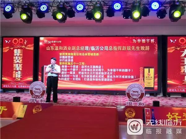 温河大王旗舰店如雨后春笋般出现,与温和酒业整体品牌规划建设及市场决策中的“五个一工程”密不可分。活动现场,温和酒业副总经理、临沂公司总指挥赵锐发表致辞,向现场嘉宾详细阐述了温和酒业始终坚持实施的“五个一”工程:做强一个渠道(温河大王旗舰店)、构建一个圈子(向幸福出发、为幸福干杯)、酿好一瓶酒(把温和大王打造成临沂名片)、实践好一句话(合作就是彼此成就,彼此为对方成就价值)、打造好一支团队(温和狼性营销团队)。