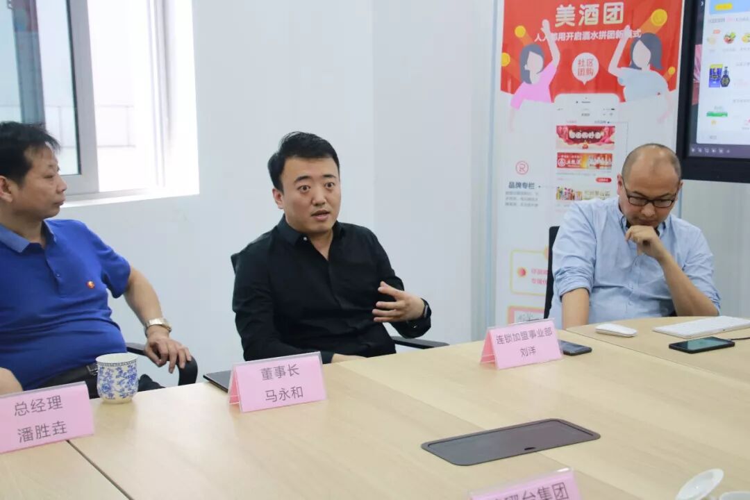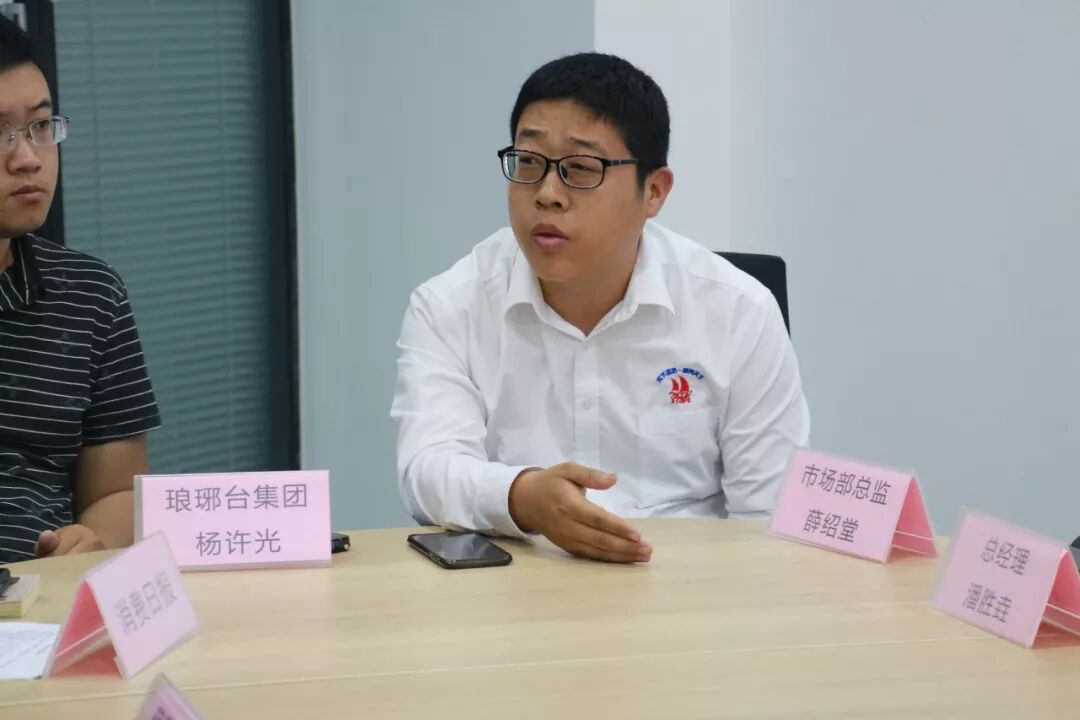 2019年5月21日,青岛琅琊台集团酒水销售公司总经理殷邦荣等人做客山东省糖酒副食品商业协会会员单位——山东天下酒坊网络科技有限公司,就琅琊台集团酒水产品入驻天下酒坊电商平台、产品推广等事宜进行了调研和交流。山东天下酒坊网络科技有限公司董事长马永和携各部门负责人进行了热情接待和详细解答。