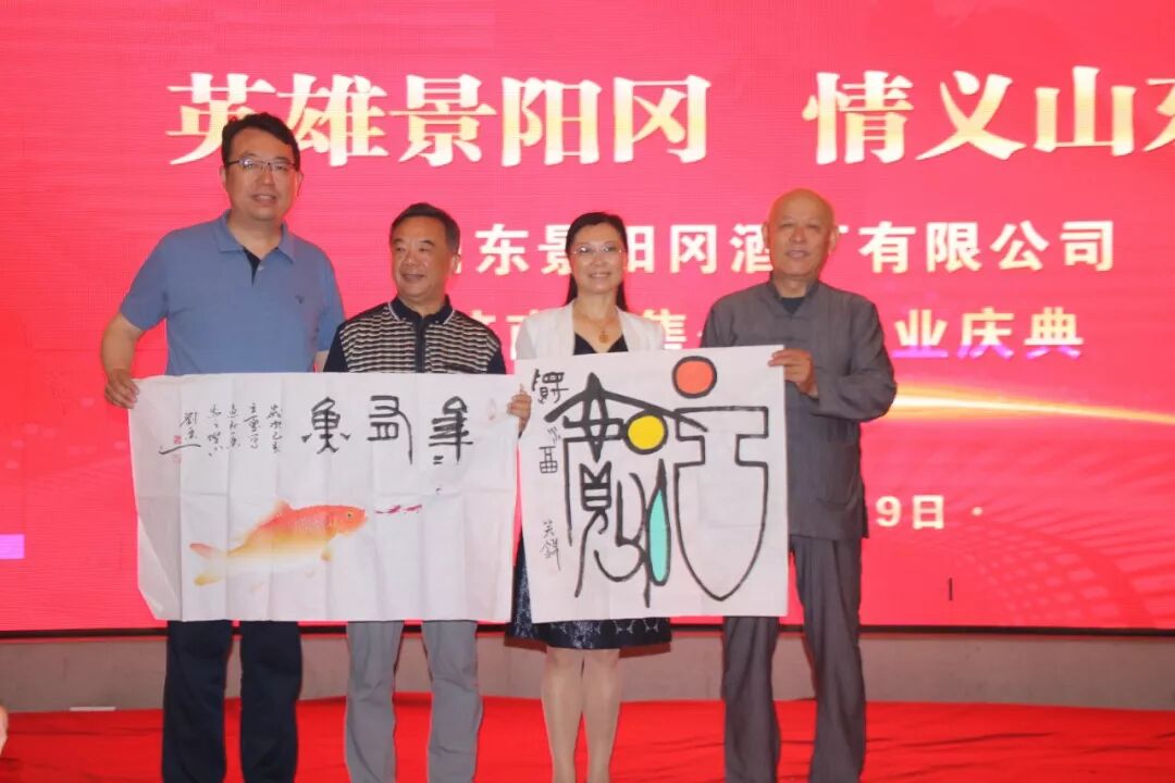 ▲(山东大学刘乐一教授,著名书法家张传发、笑镌以书画作品祝贺山东景阳冈酒厂有限公司济南销售公司开业)