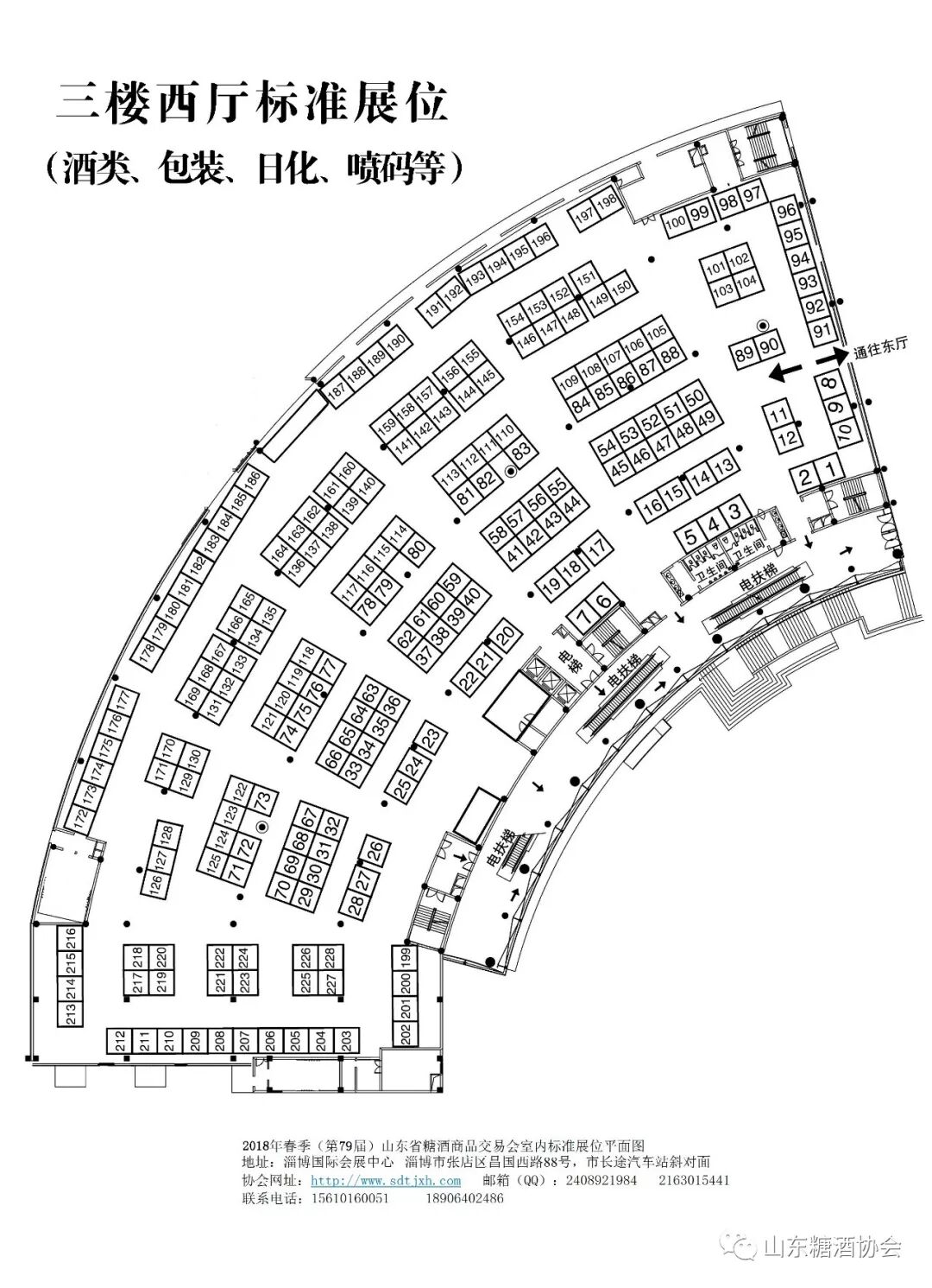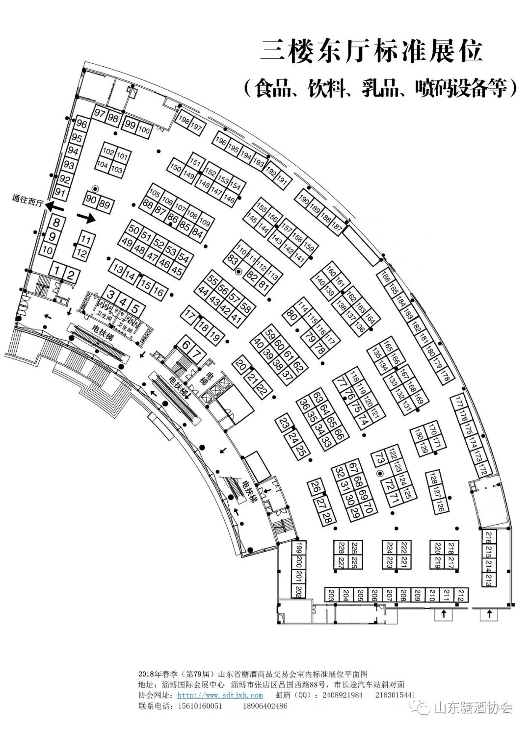 一、本届会议由省糖酒副食品商业协会主办,张店区人民政府承办,国井集团和山东新星集团协办。会议主会场设在淄博国际会展中心,淄博国际会展中心展位包括特装展位、室内标准展位(3X3)、室外标准展位(3X3)和一桌两凳展位。本届会议的室内标准展位实行分区布展,具体划分为:三楼东厅标准展位安排为食品、饮料、乳品等行业展区,三楼西厅标准展位安排为酒类、包装、日化、喷码设备等相关行业展区。特装展位、G馆标准展位、室外标准展位、一桌两凳展位不分区。会议期间各企业的宣传、展位由我会统一规划、安排。