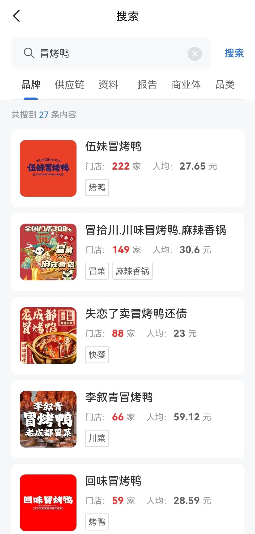 冒烤鸭的出现,开创了冒菜品类的差异化,让品类焕发了第二春,给顾客创造了新的价值感,品类门店扩张的态势更是让人难以想象。明明不过是去年年初才崛起的新品类,目前已经发展出了伍妹冒烤鸭、李叙青冒烤鸭、回味冒烤鸭,冒拾川·冒烤鸭,蜀山传奇·冒烤鸭等多个品牌,其中伍妹冒烤鸭门店数更是已达222家。
