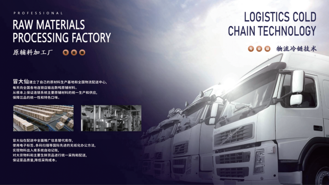 冒大仙建立了自己的原材料生产基地和全国物流配送中心,每天向全国各地连锁店输出数吨原辅材料。从根本上保证连锁系统主要原辅材料的统一生产和供应,保障出品的统一性和特色口味。并在配送中全面推广信息替代库存,使用电子标签、条码扫描等国际先进的无纸化办公方法,实现物料出入库系统自动记账,对大宗物料和主要生鲜货品进行统一采购和配送,保证菜品质量,降低采购成本。