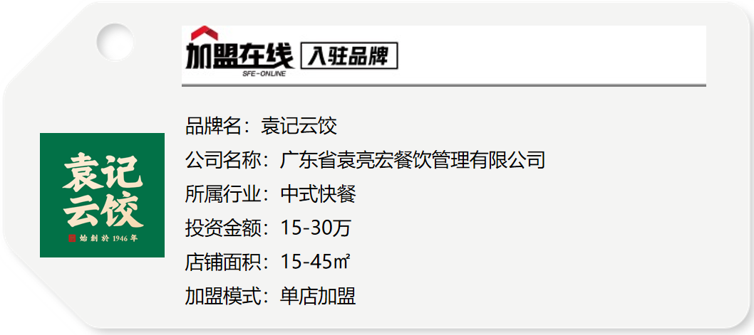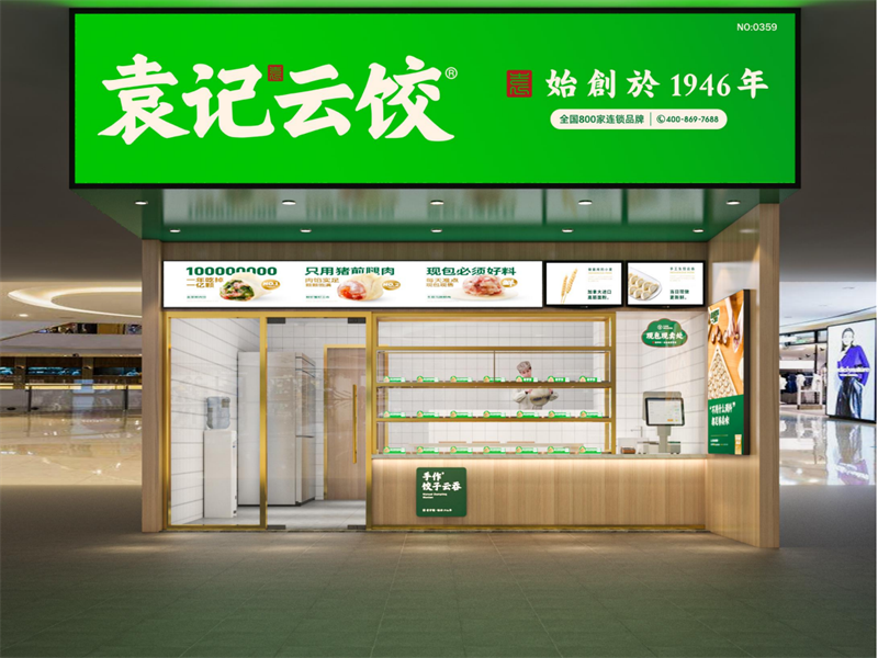 品牌介绍:袁记云饺始创于1946年,带着纯正老广州的是最为地道的广式饺子云吞。距今七十余年,始终致力于研究不同时代的饮食习惯,餐饮需求;现代人们的消费饮食结构发生变化,生活节奏加快,袁记云饺顺应时代发展,从简单的生鲜零售店到拥有店面干净明亮的舒适就餐环境的生熟一体门店,为食客提供温馨的就餐环境。