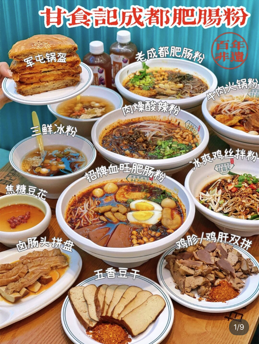 「甘食记」成都肥肠粉,是成都市非物质文化遗产代表性项目。由甘家林先生拜师于1912年开设的“成都紫东颐饭店“唐师傅门下,1935年从成都东门水码头挑担售卖起家,历经三代传承,于2008年由孙儿甘乐先生创立甘食记餐饮有限公司,以连锁经营的方式将门店开遍中国各大主要城市。从肥肠粉的选料、吊汤、煮肠、制芡、漏粉、出粉,走菜,甘食记都形成了自己的家族技艺。
