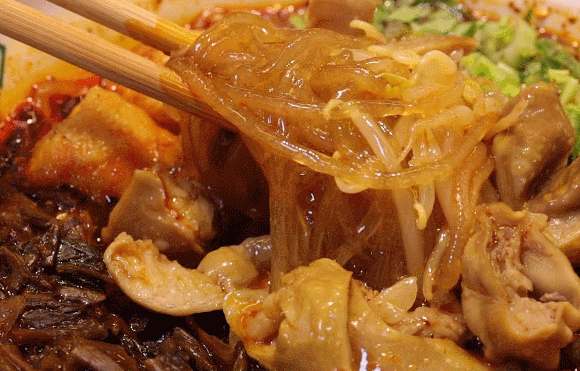 没吃肥肠粉,不算到成都!肥肠粉是以高温烹煮的肥肠为浇头,以红薯粉手工捶制而成的粉丝为主食,辅以红油辣椒、花椒、酥黄豆等川味佐料调制而成的成都特色美食。