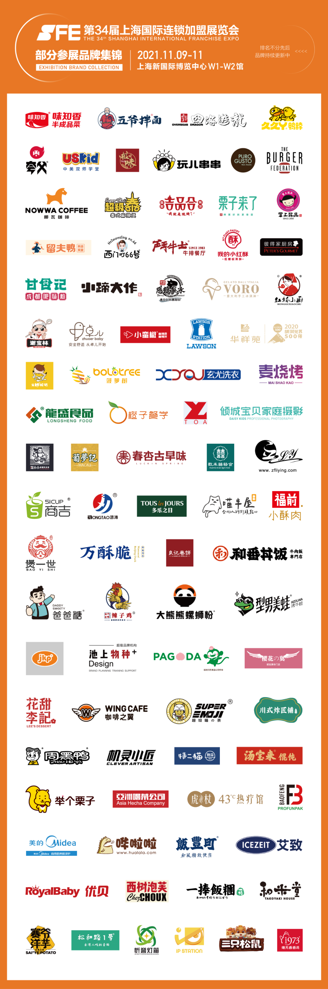 SFE第34届上海国际连锁加盟展即将盛装起航,开启新时代下加盟投资市场新篇章。展会涵盖餐饮、零售、教育、服务和连锁资源五大板块,囊括80+市场主流细分业态,600+参展品牌中,行业标杆与实力新锐齐聚,包括: