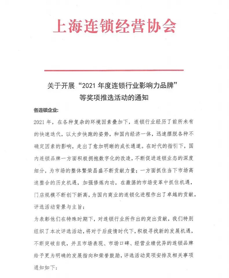 为表彰他们在特殊时期下,对连锁行业做出的特别贡献,上海连锁经营协会组织开展了“2021年度连锁行业影响力品牌”等奖项的评选活动,对后疫情时代下,积极寻找新的发展机遇,不断突破自我,并且市场表现、行业口碑、经营业绩都表现优异的连锁品牌给与更为明确的发展指向和荣誉鼓励。