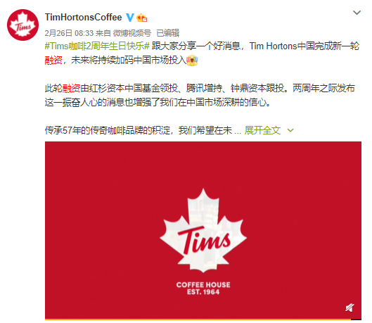 TIms咖啡在中国的业务在去年5月份就获得了腾讯数千万的投资,今年2月份,又完成新的融资,此轮融资由红杉资本中国基金领投、腾讯、钟鼎资本跟投。