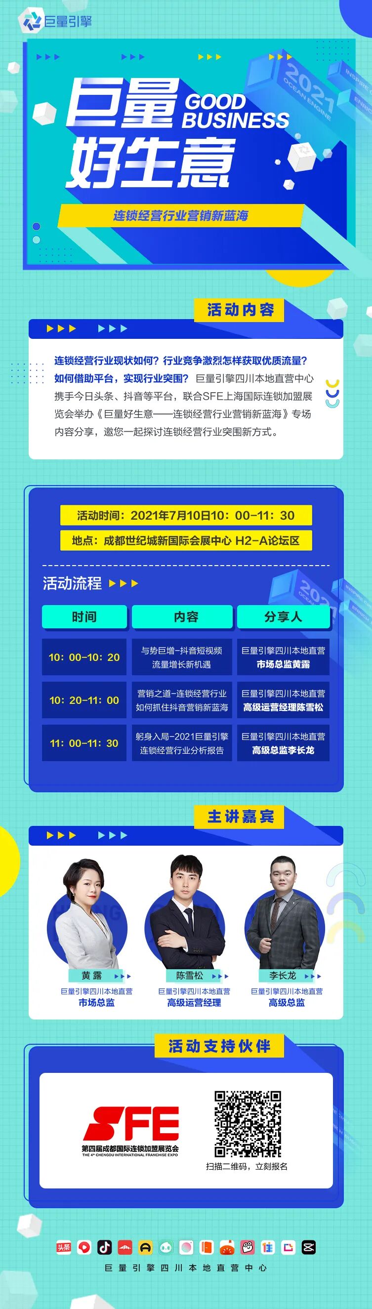 连锁经营行业现状如何?行业竞争激烈怎样获取优质流量?如何借助平台,实现行业突围?本届展会携手巨量引擎四川本地直营中心及今日头条、抖音等平台,举办《巨量好生意——连锁经营行业营销新蓝海》专场内容分享,邀您一起探讨连锁经营行业突围新方式。