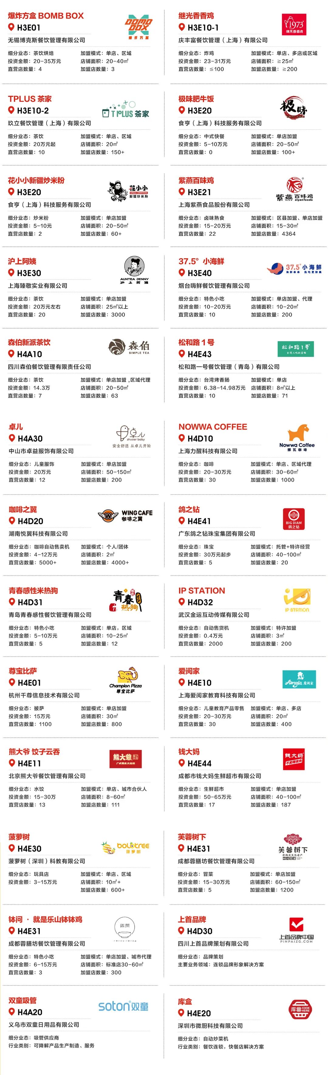 参展品牌包括紫燕百味鸡、沪上阿姨、1973继光香香鸡、冒大仙、芙蓉树下·四川非遗冒菜、钵问·就是乐山钵钵鸡、钱大妈、IP Station、尊宝比萨、TPLUS茶家、Nowwa Coffee、熊大爷饺子云吞、爆炸方盒BOMB BOX、极味肥牛饭、鸽之钻、咖啡之翼、菠萝树、爱阅家、卓儿、森伯新派茶饮等,既聚焦于包括火锅、快餐、小吃在内的成都本地的特色餐饮商业元素,同时也整合当下国内连锁加盟市场的前沿趋势,演绎国内潮流商业元素与川渝地区特色经典商业元素的精彩碰撞,成为全国标杆品牌走进西南、成都本地特色品牌走出巴蜀的优选平台。