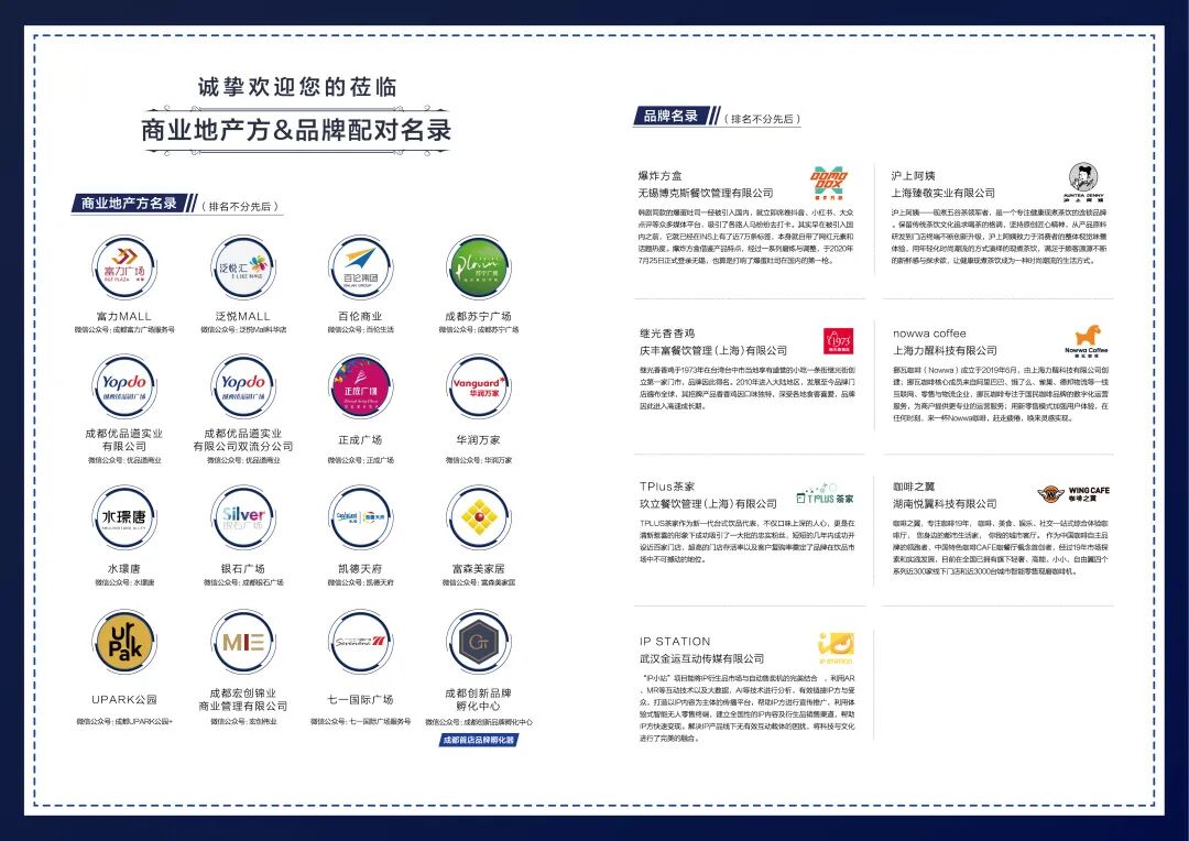 商业地产与连锁行业的发展息息相关。本届成都展,我们携手成都零售商协会,拟邀约富力MALL、泛悦MALL、百伦商业、成都苏宁广场、华润万家、正成广场、银石广场、水璟堂、凯德天府、UPARK、七一国际广场等成都本地知名成熟商业地产和新建商业地产代表,为沪上阿姨、1973继光香香鸡、Nowwa 挪瓦咖啡、爆炸方盒、Tplus茶家、IP Sation、咖啡之翼等有志于开拓成都乃至西南地区的优质连锁加盟品牌,提供绝佳的商场资源配对渠道。