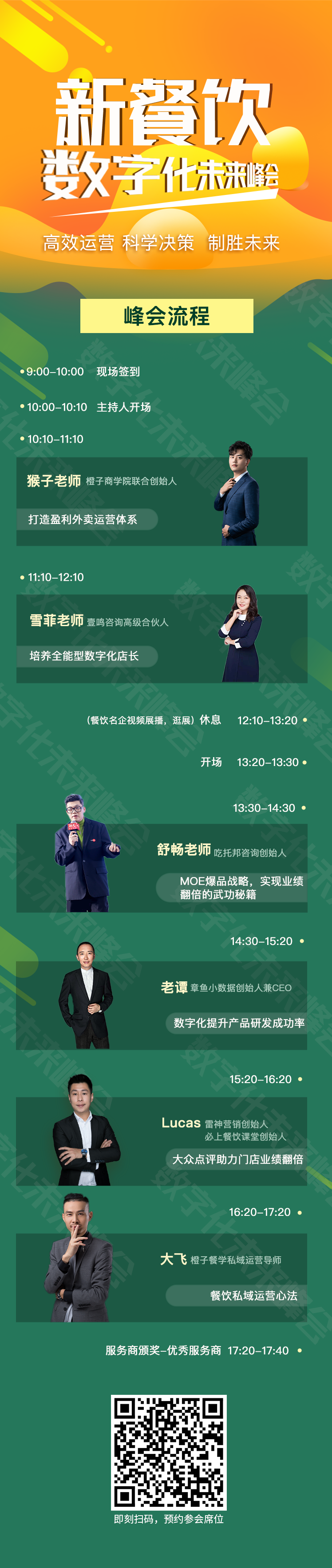 围绕【MOE爆品战略,实现业绩翻倍的成功秘籍】、【私域流量运营】、【外卖运营】、【数字化店长】、【大众点评运营】、【如何利用数字化提升产品研发率】,6个板块专业知识分享,6位讲师人均1小时的干货分享。