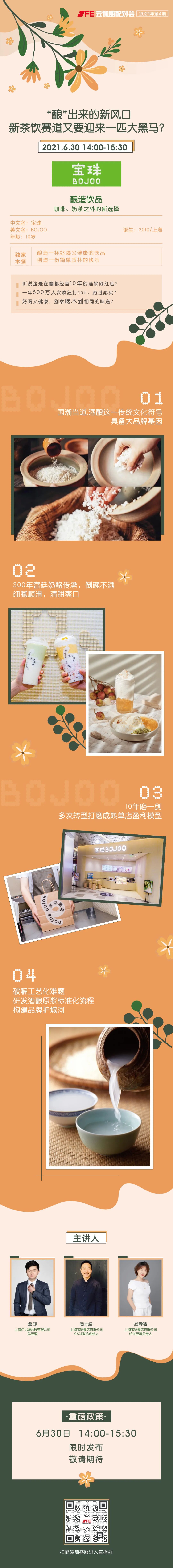2021年6月30日下午14:00-15:30,SFE云加盟配对会2021年第4期,宝珠创始人周本超和特许经营负责人龚霁晴将做客SFE云加盟配对会直播间,邀您共探新茶饮赛道,“酿”出来的新风口: