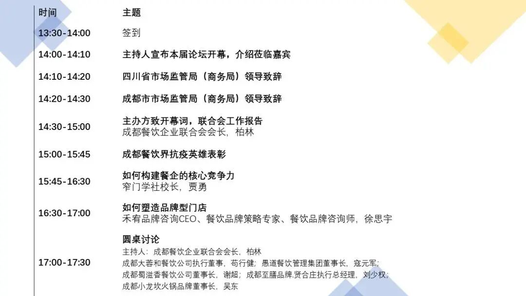 通过探讨连锁餐饮如何深耕品牌效应、成都本土品牌如何多维发展、川渝连锁品牌如何向外发展、连锁餐饮品牌如何借助供应链优势发展、餐饮品牌视觉盈利心法、连锁餐饮品牌如何持续发声、连锁餐饮门店设计标准化模块化发展规划等话题,为全国连锁餐饮品牌进行赋能和参考学习,更好的推动中国连锁餐饮品牌升级和发展。
