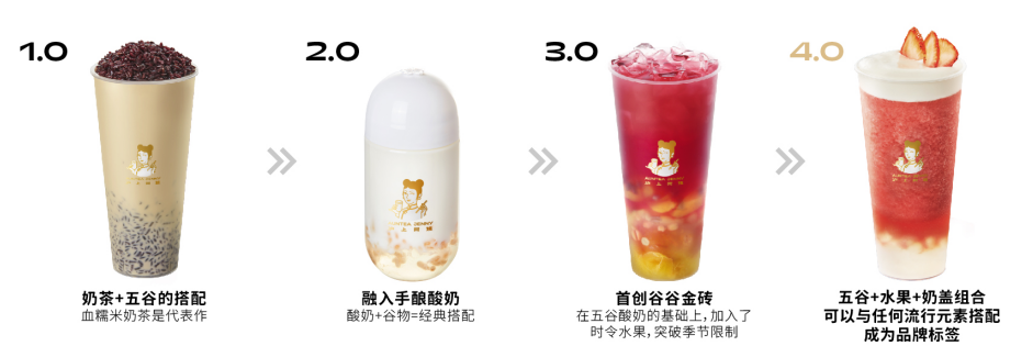 2017年3月,创新性将水果酸奶引入茶饮赛道,推出现煮五谷+手酿酸奶的经典组合;2020年3月,沪上阿姨创新推出五谷水果茶系列。