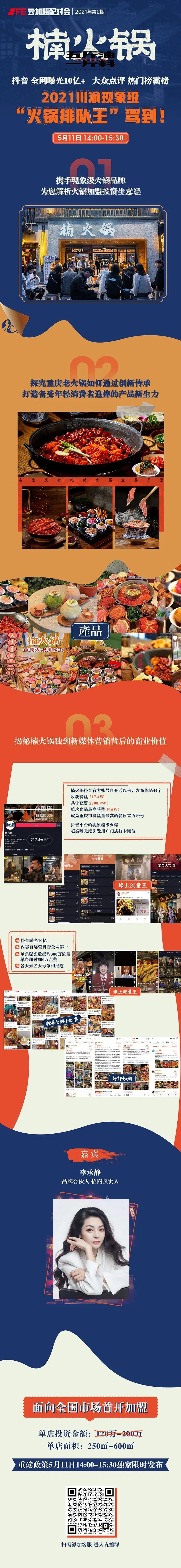 历经重庆成都两大王者级火锅市场的验证,打造出来的高盈利单店模型,楠火锅开启全国布局模式,5月11日14:00-15:30,SFE云加盟配对会携手楠火锅品牌合伙人李承静,邀您共探火锅加盟投资新趋势,并首次线上面向全国市场开放加盟,更有专享重磅优惠政策限时领取,扫码添加客服进群了解更多详情: