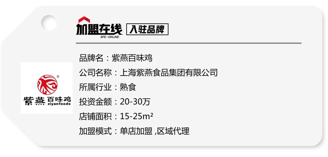 上海紫燕食品股份有限公司是一家全国性的熟食连锁企业,发源于四川,发展于江苏,现总部位于上海。30多年潜心耕耘,紫燕食品现已在全国20个省、直辖市,100多个城区开设“紫燕百味鸡”品牌连锁店超4000家,建成大型标准工厂6座,旗下还开设多个涵盖休闲餐饮、休闲卤味品类子品牌。依托丰富的产品线、供应链管控、软硬件设施建设等优势,紫燕食品从原料采购溯源、生产工艺控制、危害关键点控制、产品检验控制、冷链配送等方面建立了规范的管理体系。凭借精选的原料、特色的配方、严谨的工艺,创出以百味鸡、夫妻肺片、藤椒鸡、紫燕鹅为主的几十个特色菜肴,成功照顾不同圈层顾客的口味及喜好,并确立「紫燕百味鸡」品质、美味、健康的良好品牌声誉。自2017年起,公司连续3年入围开店邦「中国高成长连锁品牌TOP50强」,并先后获得“优秀供应链管理企业”、“互联网3.15绿色企业”、 “百强企业”等三十多个荣誉称号。