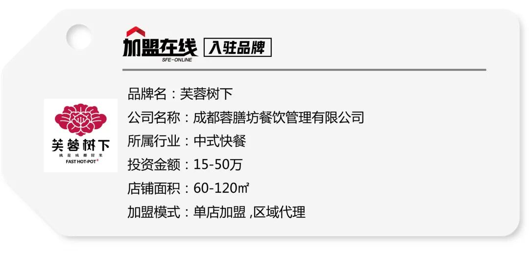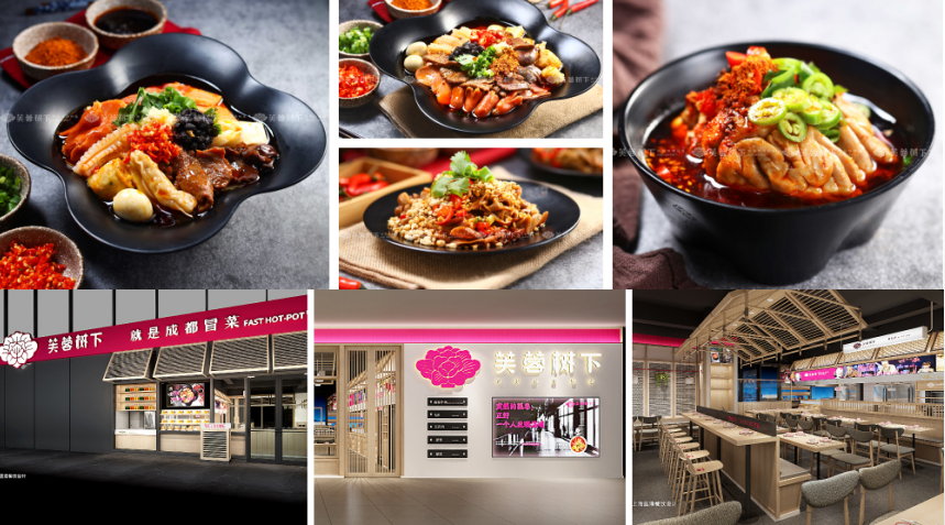 成都蓉膳坊餐饮集团旗下母品牌“芙蓉树下·品质冒菜全球连锁”,2011年由贾国金夫妇创立。创立前3年,专注打造盈利模式、产品结构、标准化手册等,内功扎实后进行连锁经营并迅速占领市场。目前,已成为拥有一千二百多家门店规模的连锁品牌。作为第一家拓展至海外的冒菜头部品牌,芙蓉树下已在宁波、石家庄、马来西亚新山、美国洛杉矶等城市建立分公司。2019年,创始人贾国金提出“小餐饮、大连锁,国民快餐的品牌突围”战略,芙蓉树下从菜品至VI,从空间至IP形象,进行了全面迭代。升级后的芙蓉树下3.0,更贴近目标客户群体90后乃至00后注重品质生活与品牌安全感的诉求,带着“幸福总会冒出来”的情感沟通,成为中国四大幸福国民快餐。
