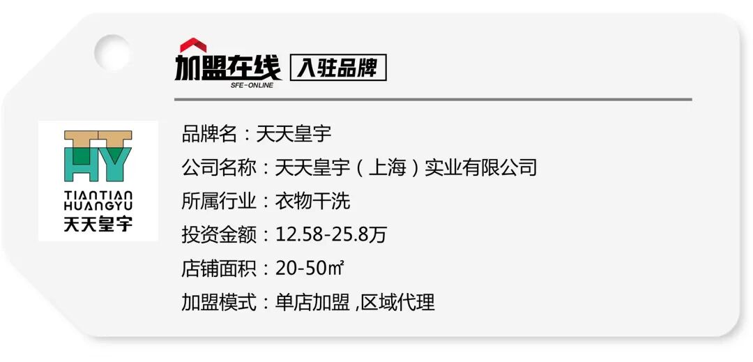 天天皇宇是“中国皮革护理产业巨头”皇宇集团的独立品牌。其创立起源于对管家文化的追溯,消费者对现代商业服务的严重不满而造成的全民消费信任危机和社会化矛盾,以及“未来家庭超级服务市场将成为必然”的趋势下应运而生。母集团凭借近20年厚积薄发的“奢侈品修复工艺”、“家庭洗护优化服务”及“绿色洗护产品研发”优势,开创出首个以“奢品、衣物、家居一站式修洗护”为核心业务的品牌。倡导人们将“焕新家务”完全从日常中分离出来,让人们释放更多时间用来享受生活。同时,天天皇宇加盟,采用统一形象,利用品牌优势,致力为B端投资人群提供一个赚钱、省心、放心的“家门口”创业平台;以直营店做示范,为加盟店提供简单快速的复制模式。