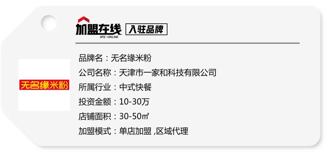 粉连锁领军品牌,无名缘全国门店已经超过3000+,覆盖全国200多个城市。无名缘米粉以鲜香麻辣、爽滑筋道、富于营养而著称。其中鲜虾捞粉、肉沫米粉、凉拌小米粉、酸辣粉等招牌产品更是好评如潮。下面无名缘将一路高歌进军广州、上海、北京、杭州等一线城市,造福更多食客的味蕾。好米粉广聚天下客,好项目尽揽天下财。无名缘米粉,已经成为最受中国消费者欢迎的快餐品牌之一,正以行业领军之势实现更多人的创业梦想,是未来7万亿餐饮市场机会中一颗最为耀眼的明星!