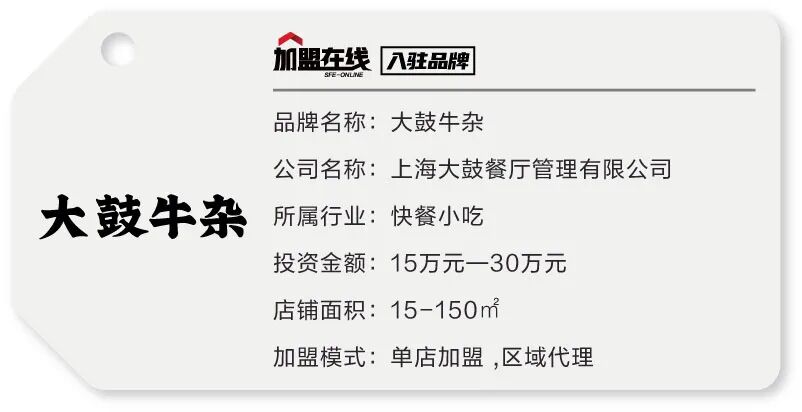上海大鼓餐饮管理有限公司,2010年在中国魔都上海落地生根,主营大鼓牛杂、大鼓米线等地方特色小吃。大鼓牛杂是以单店加盟为主。