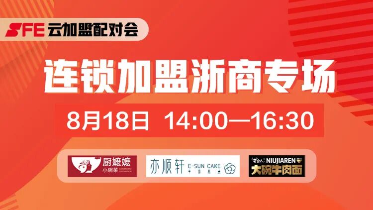 8月18日下午14:00—16:30,SFE云加盟配对会连锁加盟浙商专场邀您共赏浙江连锁品牌风范,三大实力品牌掌门人和高管详解各自细分品类市场现状与机遇,共探国内加盟投资新风向。