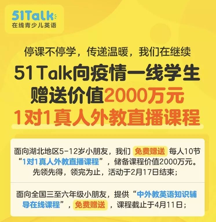 51Talk向武汉捐赠价值2000万元1对1真人外教直播课,还向全国小朋友提供免费英语精品在线课程,部分课程一经推出就迅速被约满。