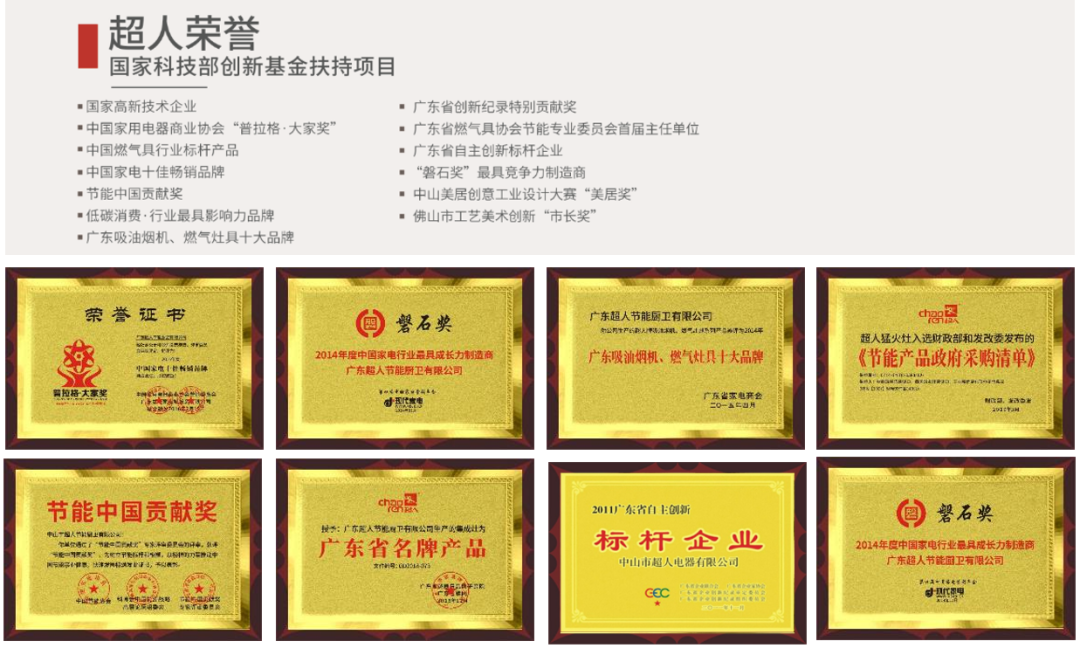 超人节能电器于上世纪90年代初创立于广西北海,2003年在中山设立生产基地,2014年将总部迁入中山市三角镇,自建80亩工业园。公司主要生产燃气灶、吸油烟机、消毒柜、热水器、集成灶、洗碗机、蒸箱、烤箱等厨卫电器产品, 31年来共推出15代内旋猛火灶技术,共获200多项国家专利,其中40多项发明专利。