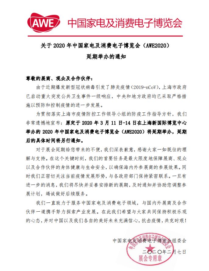为贯彻落实上海市疫情防控工作领导小组的防疫工作指导方针,我们非常遗憾地宣布:原定于2020年3月11日-14日在上海新国际博览中心举办的2020年中国家电及消费电子博览会(AWE2020)将延期举办,延期后的具体时间将另行通知。