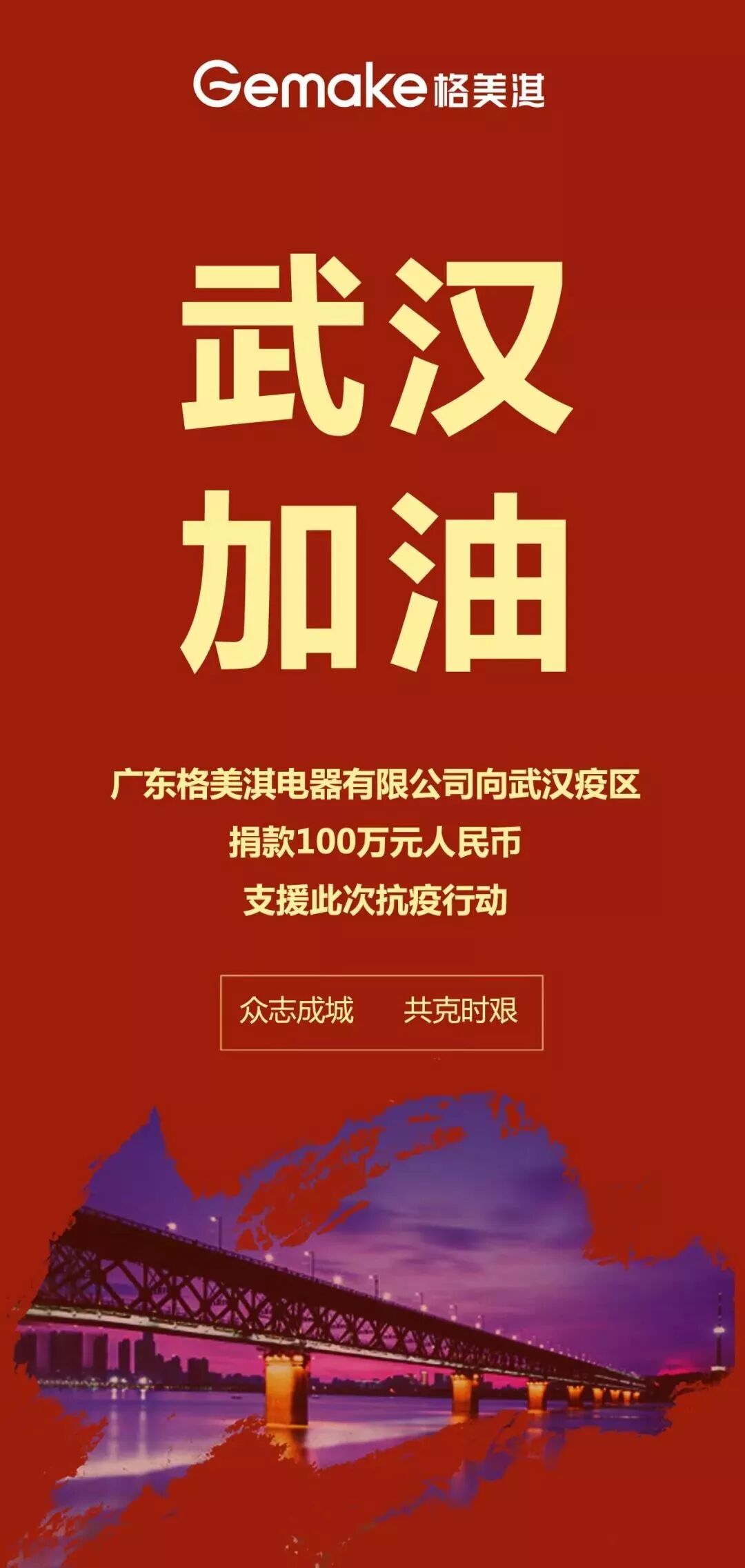 1月29日,广东格美淇电器有限公司向疫区捐款100万,与武汉人民同舟共济,共同抗击疫情。
