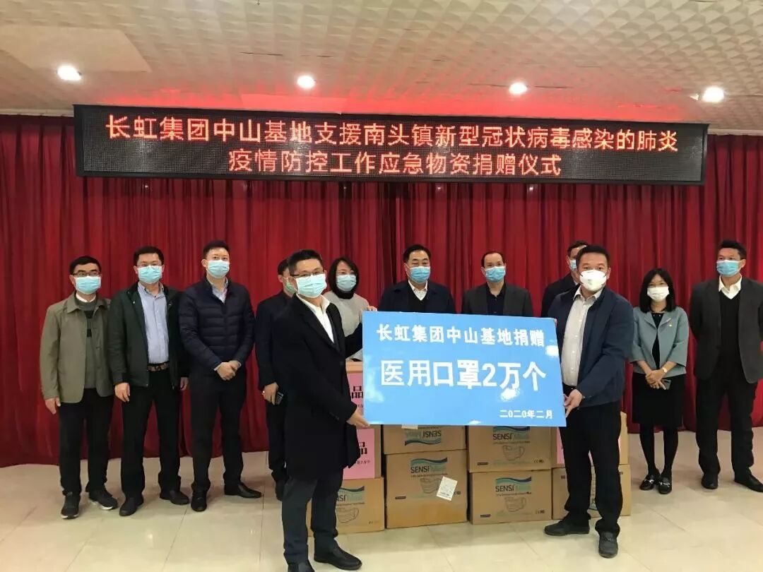 在全国人民全力抗击新型冠状病毒感染的肺炎疫情的关键时刻,长虹集团中山基地快速启动长虹海外子公司和驻外机构紧急采购防疫物资,于2月2日向南头镇新型冠状病毒感染的肺炎疫情防控指挥部捐赠2万个医用口罩。