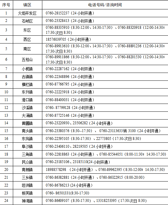 中山市各镇区疫情防控公众咨询电话一览表