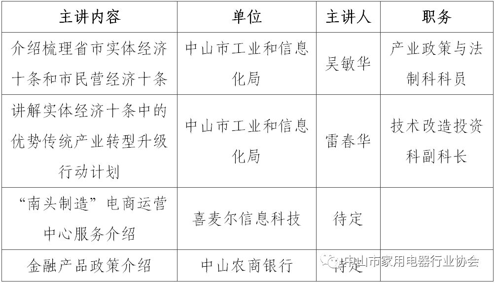 《报名回执》请点击下方“阅读原文”进入协会官网下载。或关注“中山市家用电器行业协会”公众号后直接回复“主题+企业名称+姓名+职务+手机”(如:优势传统产业企业转型升级政策宣讲推介会+赵XX+经理+139xxxx)