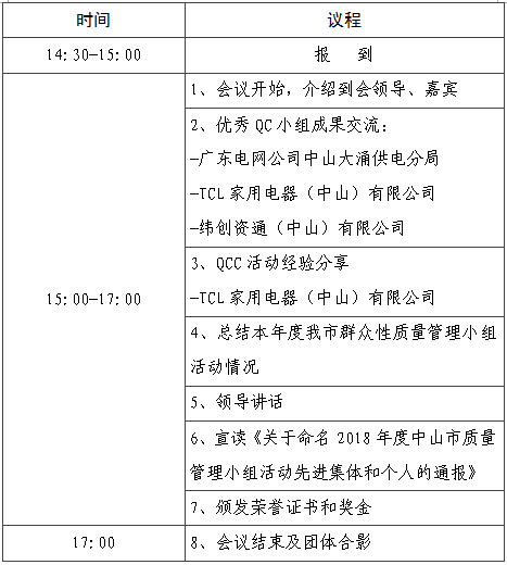 为落实市政府质量强市工作精神,进一步营造“质量意识深入人心、质量管理深入人心、质量提升深入人心”的良好氛围,促进中山市QC小组活动成果交流、学习与分享,现组织会员企业参加由中山市质量技术协会主办的第八次质量管理小组活动代表会议。