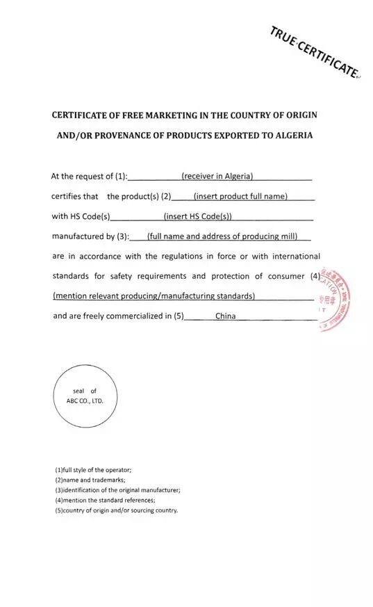 根据中国贸促会官网信息,近期阿尔及利亚商务部出台新规,对出口至阿的货物要求提供原产国有权机构盖章的“自由市场证书”,在阿方银行备案后方可获得其为出口企业开具的信用证。