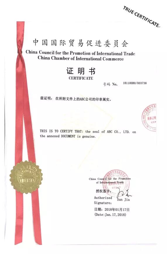 提示:中国贸促会及其授权分支会对企业出具的“自由市场证书”一律以商事证明书的认证方式出证,下图为中国贸促会官网提供商事证明书样本。