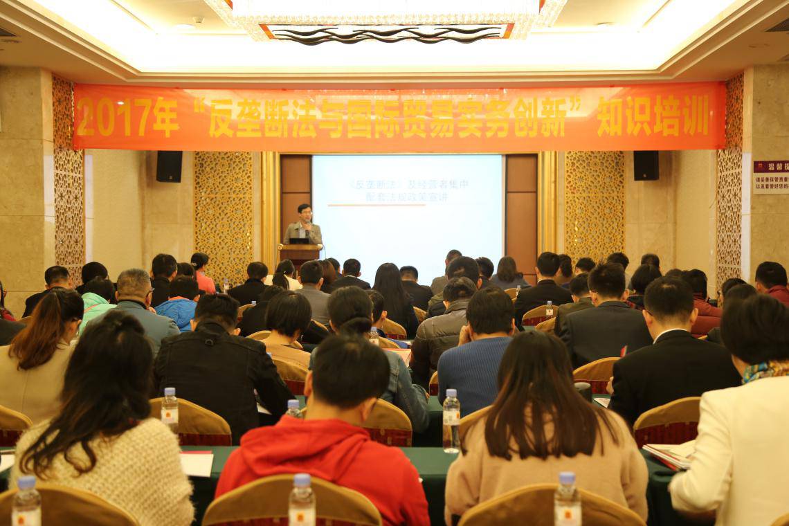 为进一步做好《反垄断法》宣传及《国际贸易实务创新》工作,帮助企业在实施“一带一路”和粤港澳大湾区战略部署中提高应对贸易摩擦策略水平,12月15日,我会联合广东省家电商会在中山阜沙国贸酒店举办了“反垄断法与国际贸易实务创新知识”培训。广东省商务厅公平贸易局反垄断处主任科员王学艺,中山市商务局副局长刘宇宏及省内各地区企业代表100余人参加培训。本次培训由广东省家电商会副秘书长吴娟美主持。