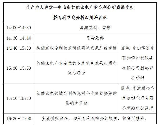 本次培训以自愿参加为原则,参加培训的企业学员请于11月29日16:00前填妥《报名回执》后回复至协会秘书处。《报名回执》请点击左下方“阅读原文”进入官网下载,或关注“中山家电”公众号后直接回复“主题+企业名称+姓名+职务+手机”(如:中山市智能家电产业专利分析成果发布暨专利信息分析应用培训班+中山市XX电器有限公司+赵XX+经理+139xxxx)