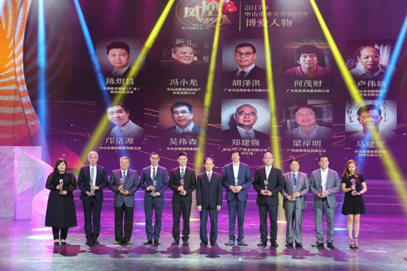 在2017 年中山市非公有制经济凤凰奖评选活动中,何茂财等10 位民营企业家,被评选为2017 年中山市非公有制经济凤凰奖 “博爱人物”。