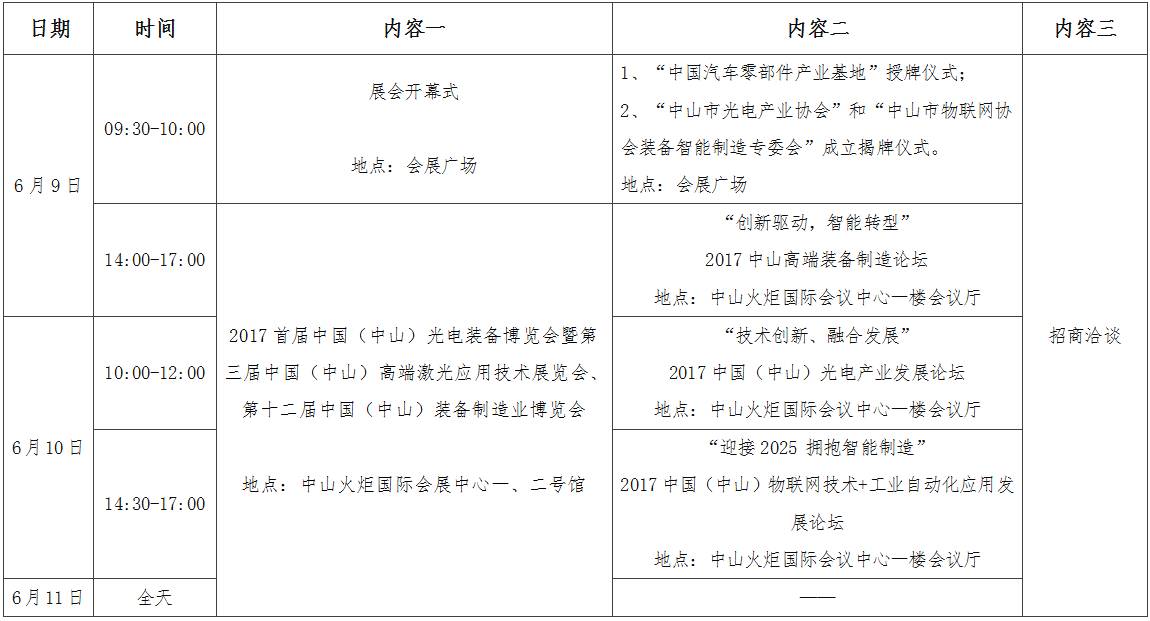 2017首届中国(中山)光电装备博览会暨第三届中国(中山)高端激光应用技术展览会、第十二届中国(中山)装备制造业博览会定于6月9-11日在中山火炬国际会展中心举行。