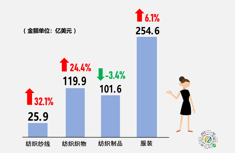 3月当月,我国纺织品服装出口220.5亿美元,同比增长16.8%(以人民币计同比增长15%)。其中,纺织品出口118.3亿美元,同比增长22.4%(以人民币计同比增长20.5%),高于全国货物出口同比增速7.7个百分点;服装出口102.2亿美元,同比增长10.9%(以人民币计同比增长9.2%),增速较去年四季度有所回落。
