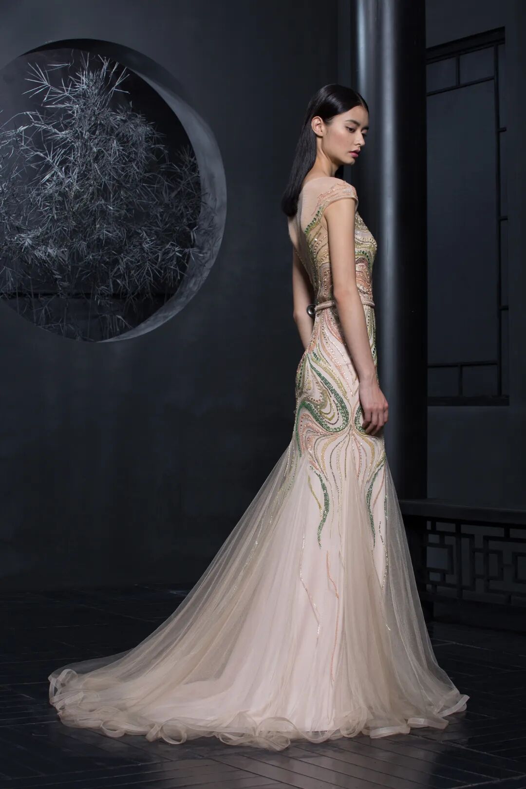 这款钉珠连衣裙设计灵感来便源于潮州珠绣,是潮州传统匠心工艺与现代服装设计结合的产物。珠绣匠人在雪纺料、礼服缎上,运用珠绣平针、垫针、掺针、过桥等多种针法技艺,巧妙将各种规格的珠料精工绣制出枝叶繁茂、丝瓣散花等写意形象,附着在美观大方的礼服裙上,将潮州珠绣的华丽美感表达与礼服设计的精神需求完美契合,产生出独特的艺术效果。