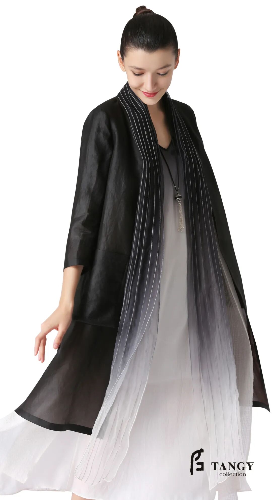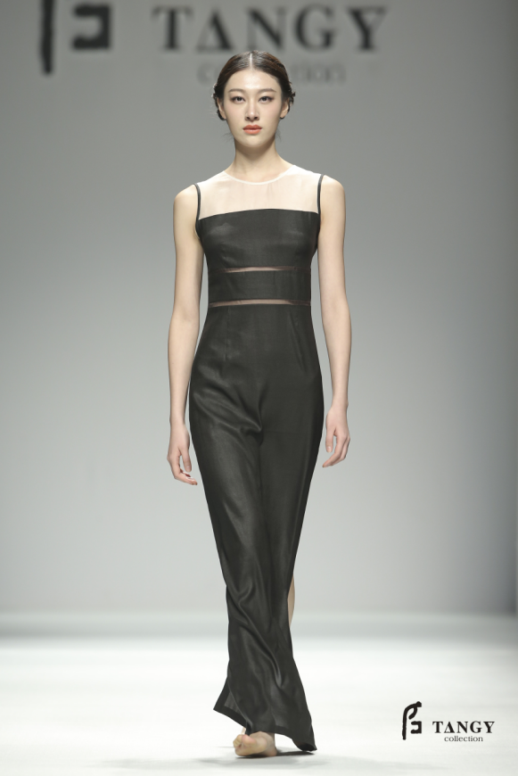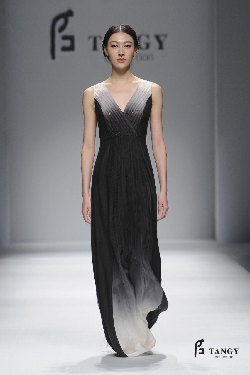 就如这款设计作品《清墨》将中国传统山水画作中浓淡相宜的墨色,与莨绸独一无二的“黑”相结合作为主要创作灵感。运用传统手工吊染工艺,线迹交错层叠如细腻工笔,通过人行动时带来的风、韵,将服装看作是一幅灵动的笔墨山水画,散发婉约的艺术气息。