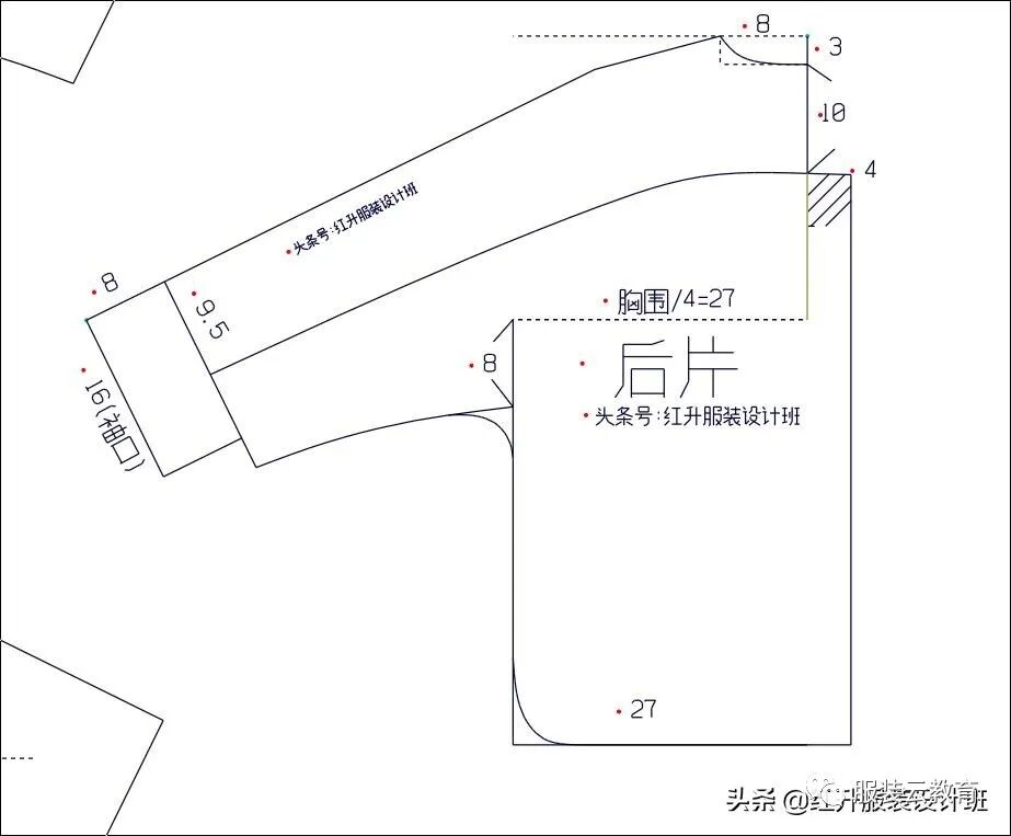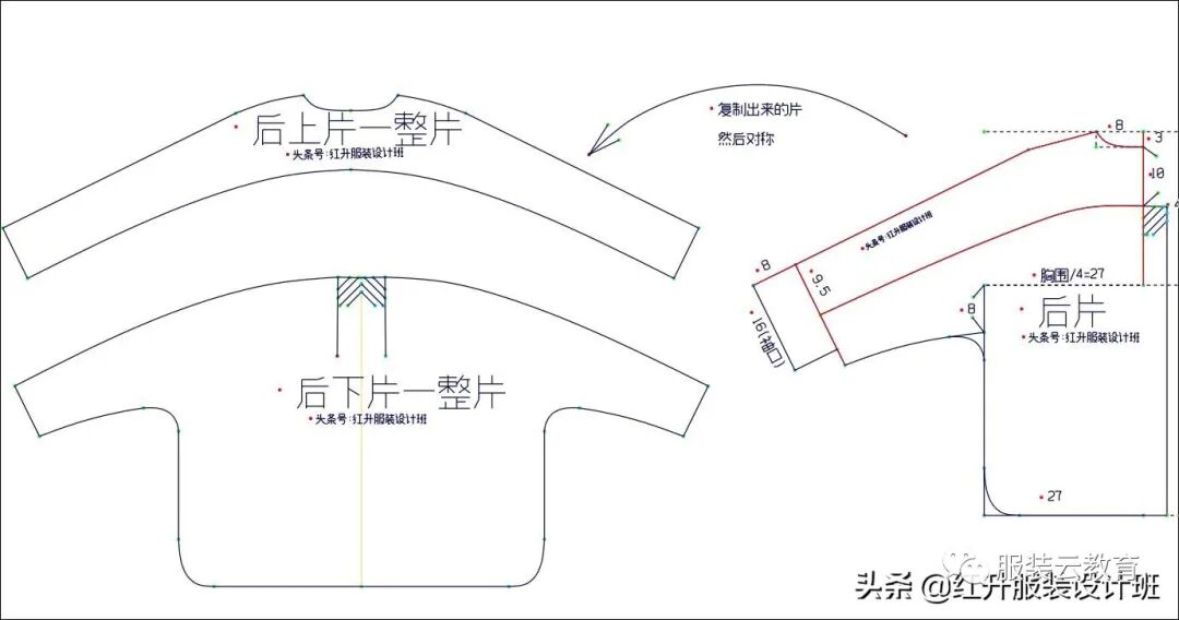 以右侧红色区域复制出来的左侧上袖部分,为一个大的整片,如果面料幅宽太窄的同学,中间可以断开的。